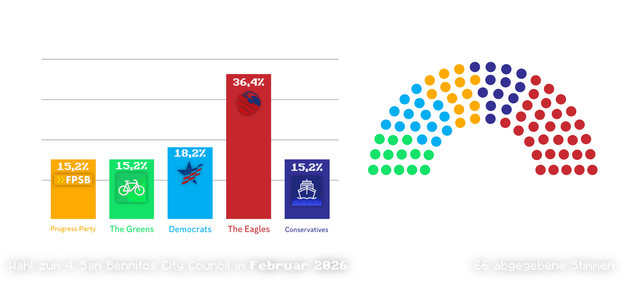 Der Wahlgewinner *<mark style="color:$danger;">**The Eagles**</mark>* koaliert mit den thematisch ähnlich aufgestelltes *<mark style="color:blue;">**Conservatives**</mark>* zur so genannten *Befreiungskoalition* (engl. "Liberation Coalition"). Zusammen haben sie 44 Sitze im City Council und damit mit genau einen Sitz mehr als man für die absolute Mehrheit braucht.