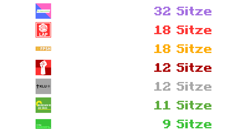Bei der Wahl konnte sich die konservative und patriotische Partei **Die SHRIMPS.** durchsetzen. Sie gewann mit **25,9%** die Wahl.
