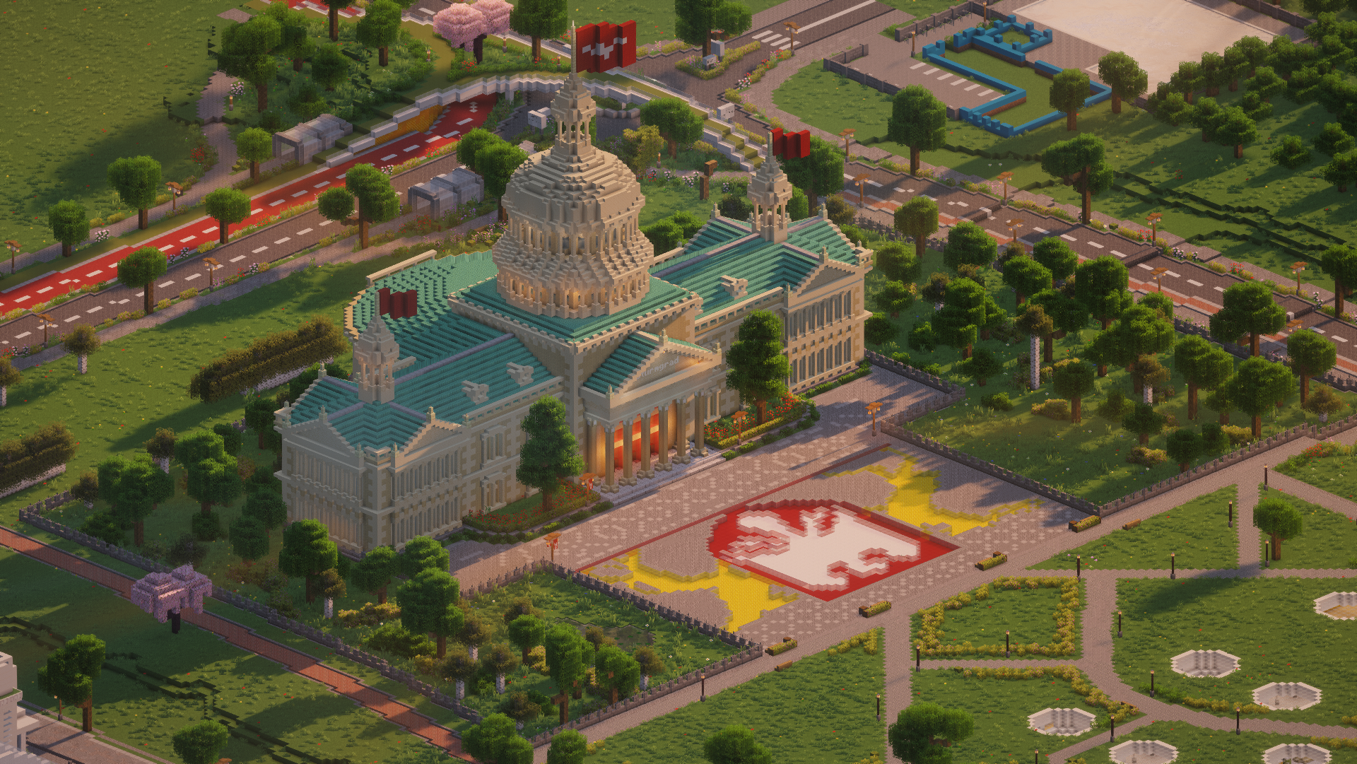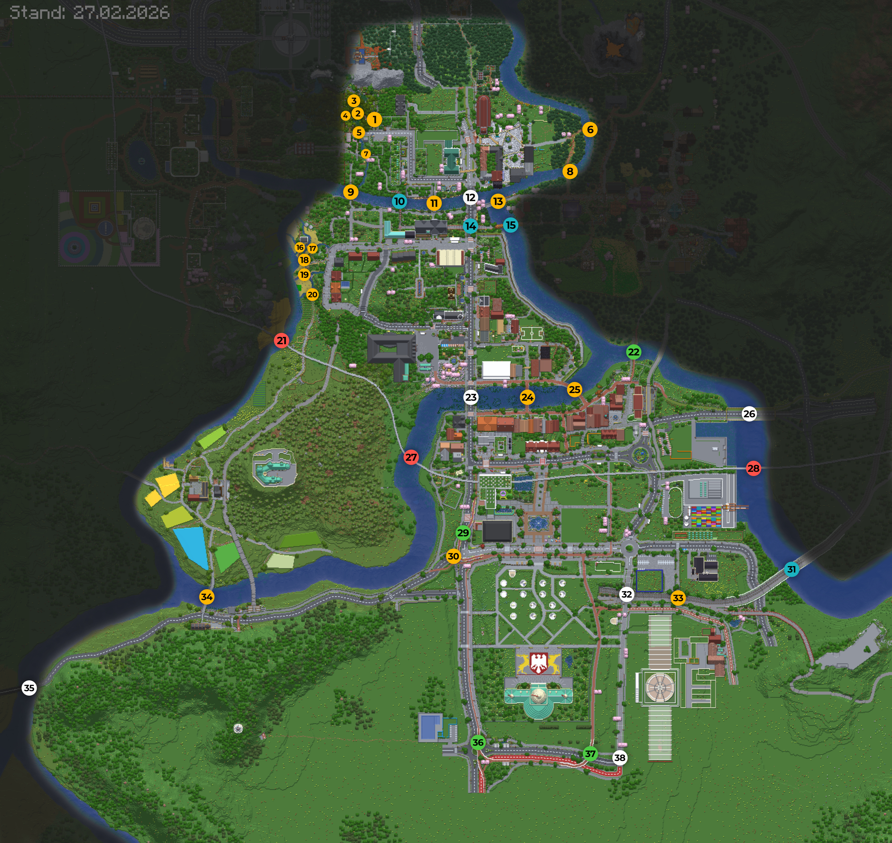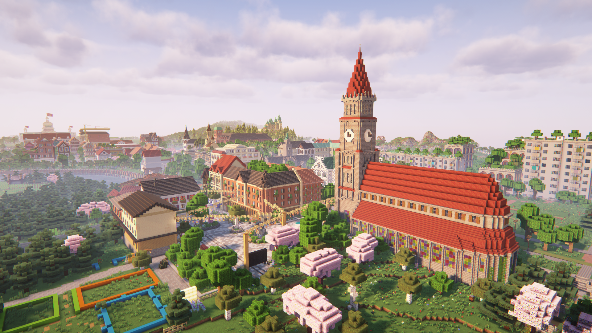 Des Weiteren wurden viele große Gebäude im neuen Stadtzentrum gebaut. So auch der neue ***Stadtrat***, der mit einem Kupferdach und großen Vorplatz daher kommt. Dort wird – immer passend [zur aktuellen Wahl](#stadtrat) – auch die Mehrheitsverhältnisse reingebaut!