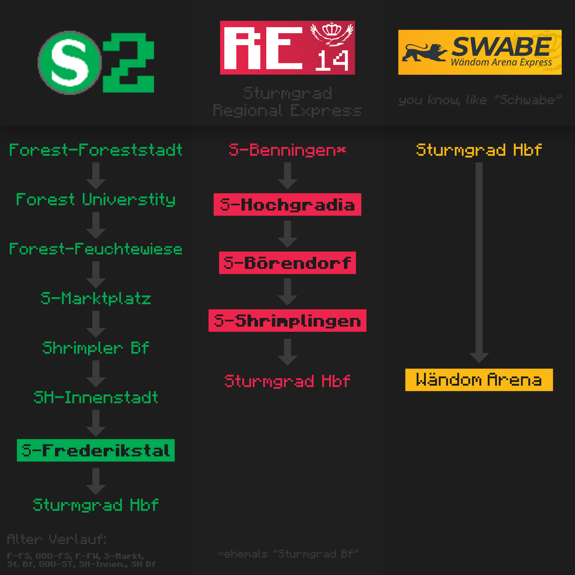 Am **01. November 2025** gab die staatliche [Honig-Bahn](https://wiki.honigstadt.de/unternehmen/staatliche-unternehmen/honig-bahn) dann bekannt, das Sturmgrader Verkehrsnetz in Absprache mit der neu [gewählten Ampelregierung](https://wiki.honigstadt.de/projekte/siebter-stadtrat#regierung) [<mark style="color:yellow;">**(i)**</mark>](#user-content-fn-5)[^5] umzuplanen. Die <mark style="color:green;">**S2**</mark> wird dabei vollständig umgestaltet und von ihrem bisherigen, kuriosen Verlauf abgelöst. Ebenso werden für die Neubauten in den [südlichen Stadtteilen](#stadtteile) der Stadt zwei neue Bahnen eingeführt: Der **Regional-Express 14** oder auch kurz **RE14** sowie der **SWABE**, eine Abkürzung für *Sturmgrad Wändom Arena Bahn Express*.&#x20;