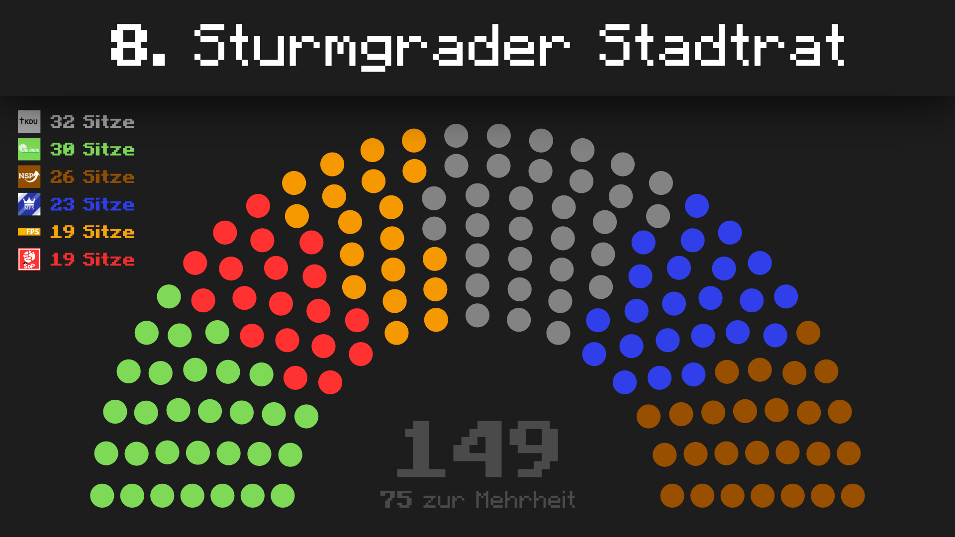 Bei der Wahl zum 4. Sturmgrader Stadtrat erhielt die Krispdemokratische Union, kurz KDU, knapp 26% der Stimmen und koalierte mit dem FPH-Ableger FPS. Zusammen haben sie eine Mehrheit von 55% der Sitzen und stellen sie die erste Sturmgrader Bürgermeisterin: **Pandela Märkel**, von der KDU.